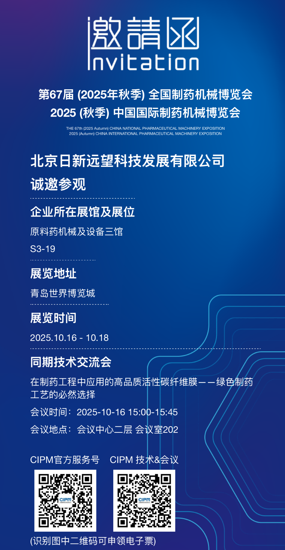 2025年10月16-18日,“第67届(2025年秋季)全国制药机械博览会暨2025(秋季)中国国际制药机械博览会”在青岛召开。公司在原料药机械及设备三馆S3-19展位有展出高品质活性碳纤维膜及设备,欢迎各位领导莅临参观指导。